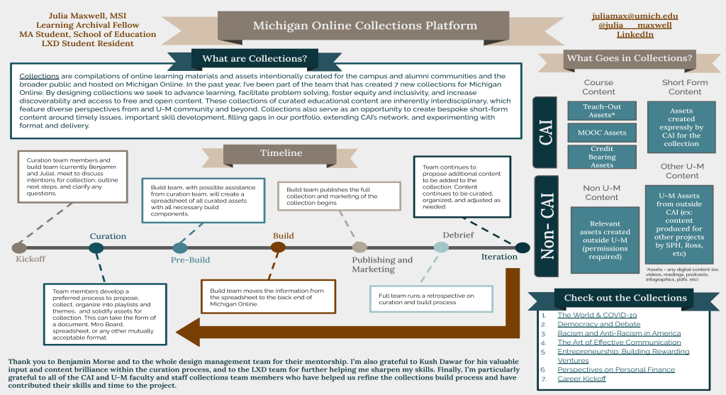 In 2020, I took on a leadership role in the development of Digital Collections for the Center for Academic Innovation at the University of Michigan. My role surrounds providing curation leadership, building the collections online, and maintaining them. In this poster, I provide an overview of the curation process.