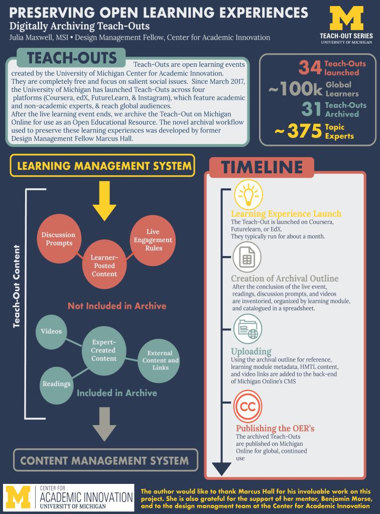 This poster was created for the Society of American Archivists ARCHIVES*RECORDS 2020 Conference. It details the digital archival process I use for preserving the Teach-Outs created by the University of Michigan. Check out all of the archived Teach-Outs at Teachout.org.